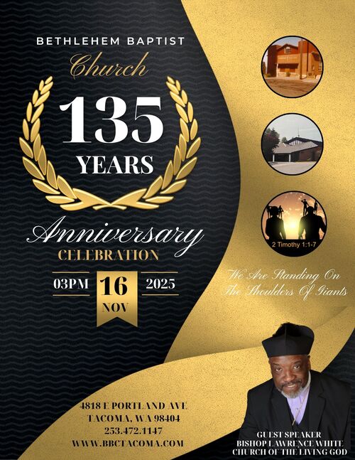 Sweet Bethlehem marks her 135th Church Anniversary with special guest Bishop Lawrence White on Sunday - November 16 at 3 pm. Dinner will be served from 12 noon to 2:30 pm. There will NOT be morning service on Anniversary Sunday.
